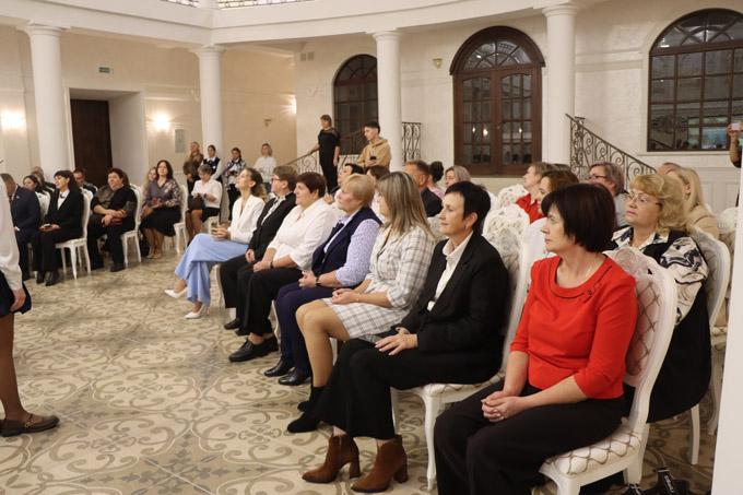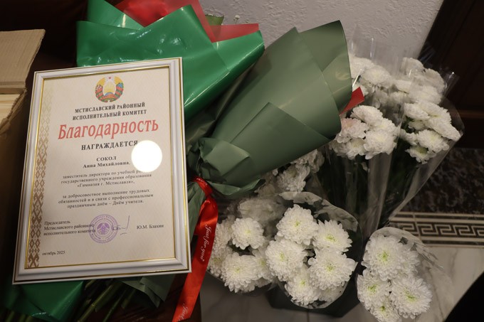 Поздравила и пожелала новых профессиональных достижений заместитель председателя райисполкома Татьяна Бричикова. Она вручила представителям сферы образования почётные грамоты главного управления по образованию Могилёвского облисполкома. Среди награждённых — главный специалист отдела по образованию райисполкома Елена Воронцова. Также наград удостоены педагог ЦДТ Людмила Палеева и учитель физкультуры и здоровья СШ № 2 г. Мстиславля Геннадий Пискижов.