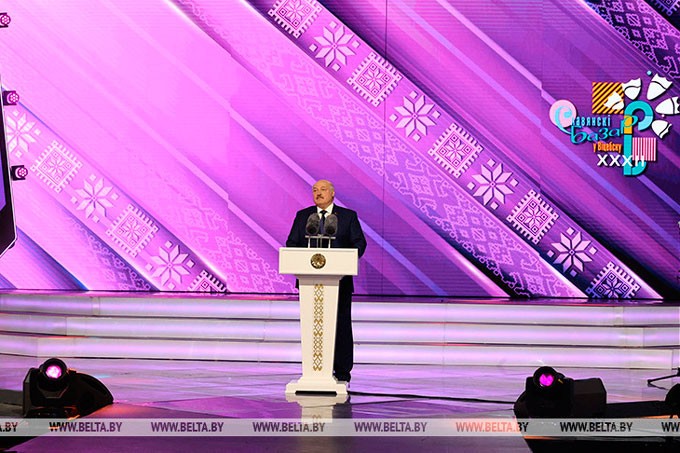 «Эту историю пишете вы — наши любимые артисты, художники, композиторы, поэты, народные мастера. Я от всей души благодарю всех, кто дарит нашему празднику частичку своей души. Мы слышим ее в песнях, видим в театральных постановках, танцевальных номерах и уличных представлениях, в уникальных декоративных изделиях. Мы все, участники, организаторы, гости, создаем здесь удивительную атмосферу истинного, настоящего искусства, которое объединяет народы и государства. Искусства, которое прекрасно своим национальным колоритом, которое является поистине высоким, всегда поднимаясь над политическими играми и интригами», — подчеркнул белорусский лидер.