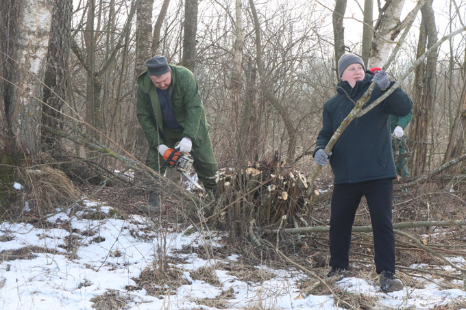 Представители трудовых коллективов ЦФОР «Олимп», ДЮСШ, отдела культуры райисполкома, Могилёвского филиала автопарка №1 и других занимаются вырубкой древесно-кустарниковой растительности. С пилами и мотокосами они убирают прошлогоднюю траву и разросшиеся кустарники.