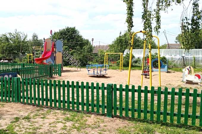 В Копачах продолжают благоустраивать детскую площадку. Вокруг детской площадки, ставшей центром детского досуга, возведён забор.